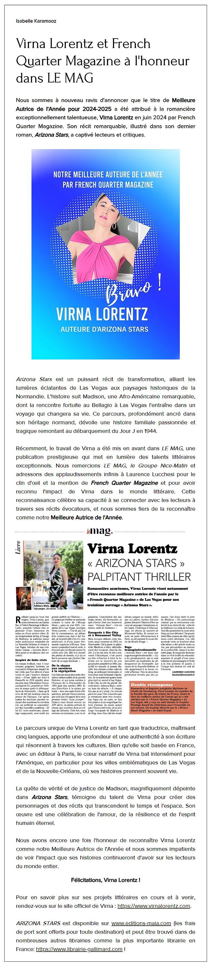 Interview Riviera Beach Magazine, Virna Lorentz & Yann Bernard, Arizona Stars Roman Novelist